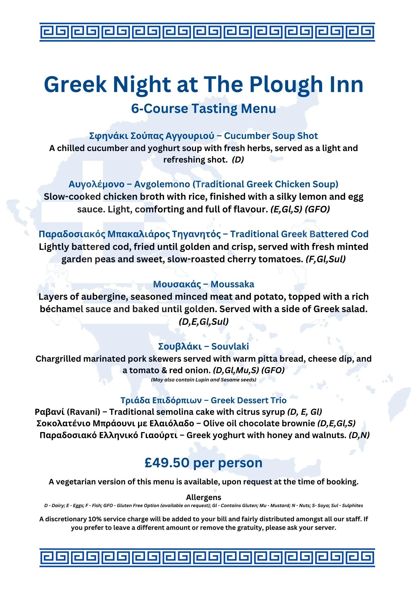 Join us at 6:30pm for a very special Greek menu created by Billy - our Greek Head Chef.Booking in advance only - Please arrive for 6:30pm - Dining will start at 7pm. Weds 25th March 6:30pm